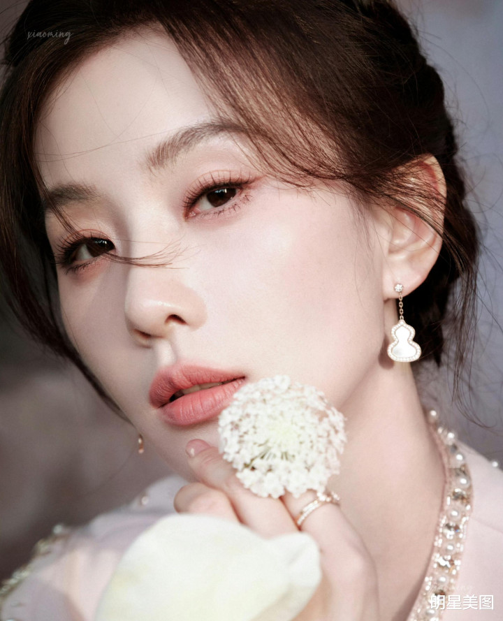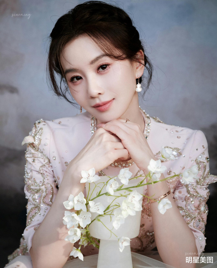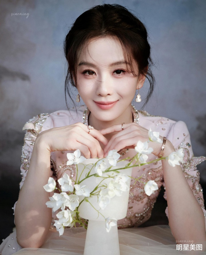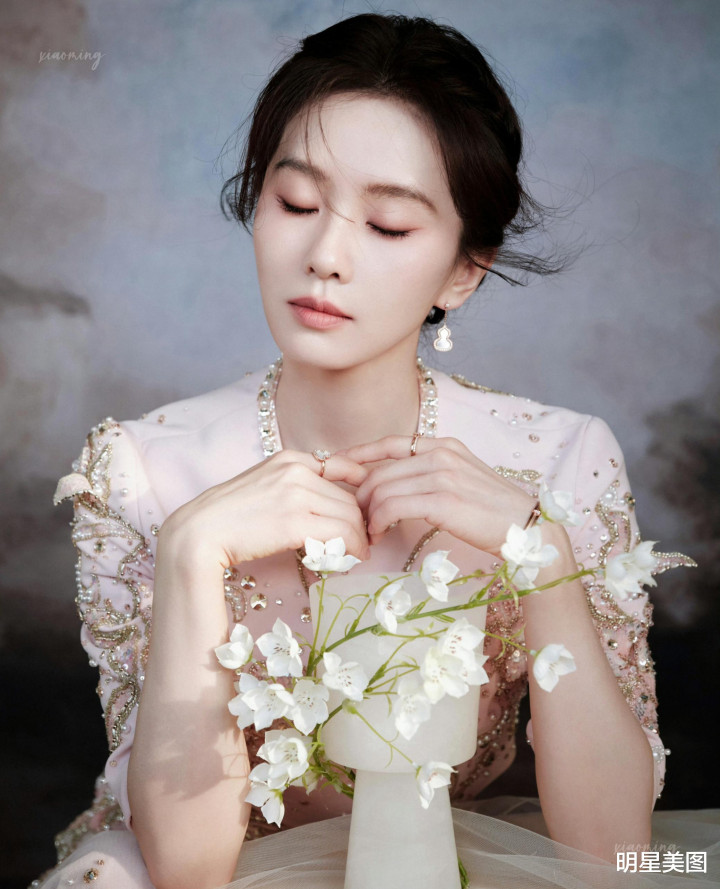 刘诗诗淡粉礼裙金线珍珠流转,双手抵下颌眉眼和气,与铃兰相映成画