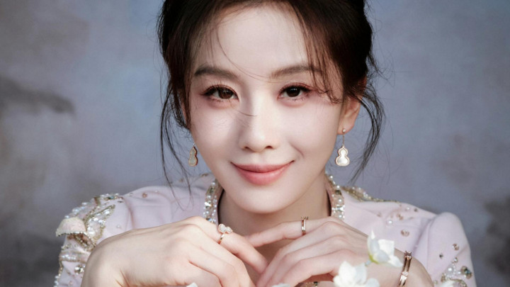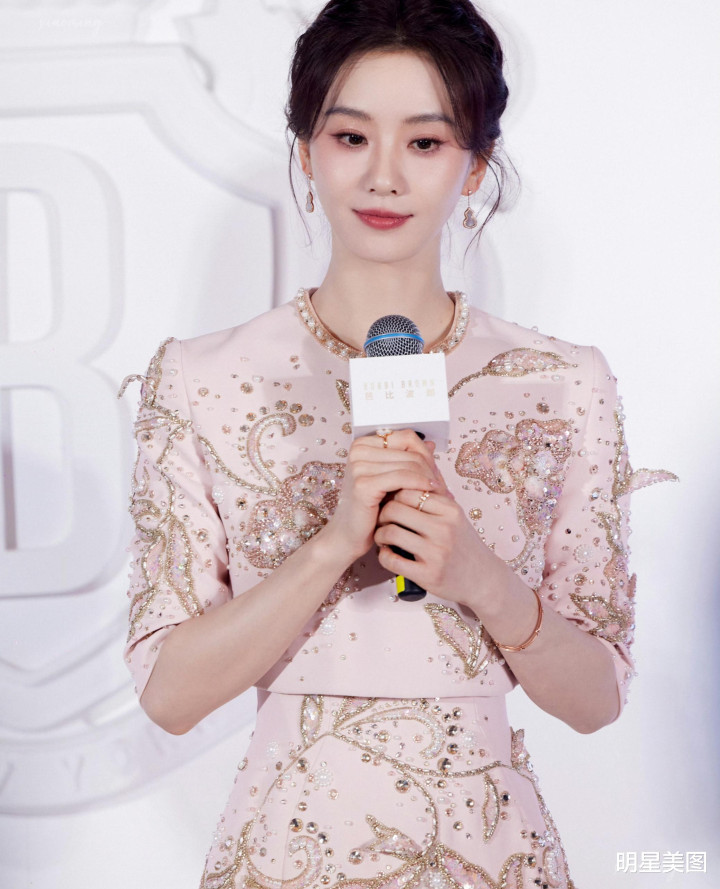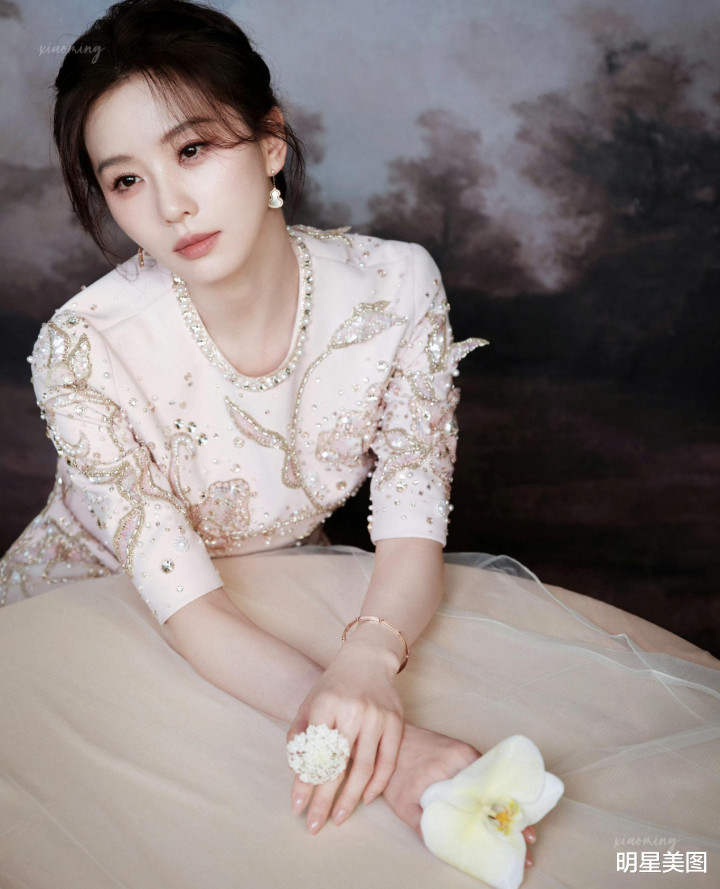 开云体育 刘诗诗淡粉礼裙金线珍珠流转, 双手抵下颌眉眼和气, 与铃兰相映成画
