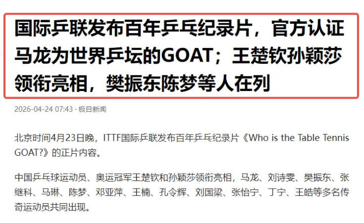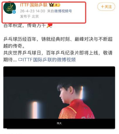 2026年4月23日,国际乒联发布百年乒乓记载片。