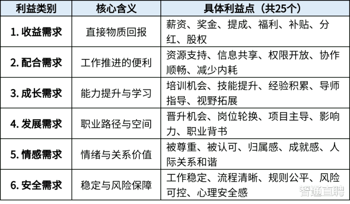 职场的执行是利益交换,不同的东说念主,利益诉求也不同样。王专淳厚的《说到点上》一书中,有整理到职场多元利益表。